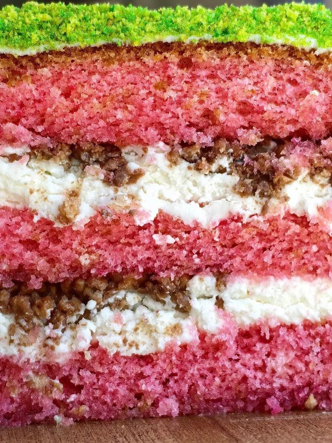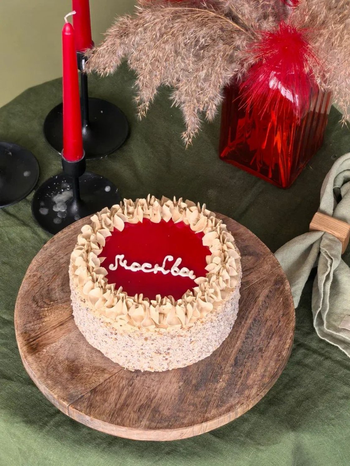 Меренговая основа, начинка фруктовая вишневая, крем на основе творожного сыра и натуральных сливок. Масса: 800гр