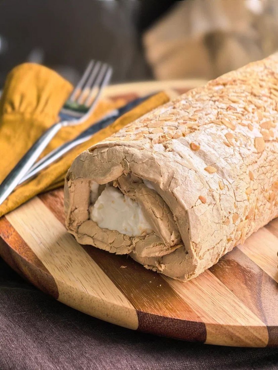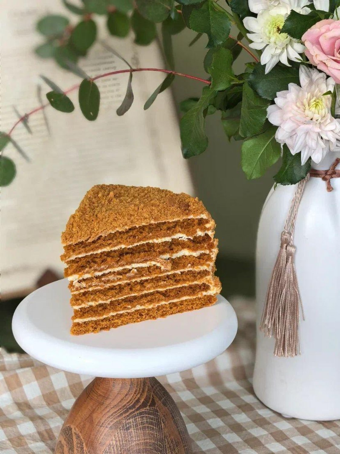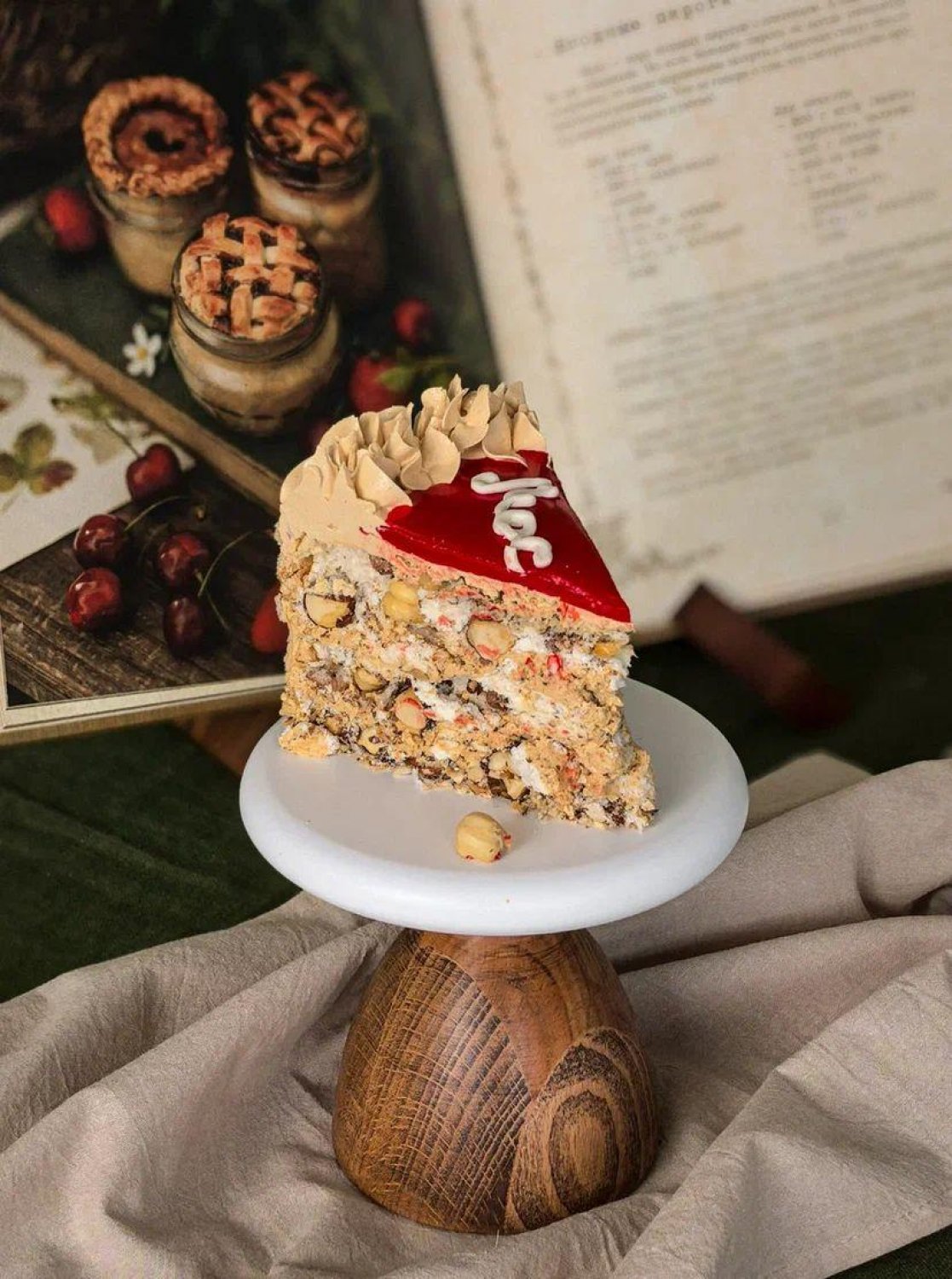 Воздушно-ореховый бисквит, крем сливочный с вареной сгущенкой.