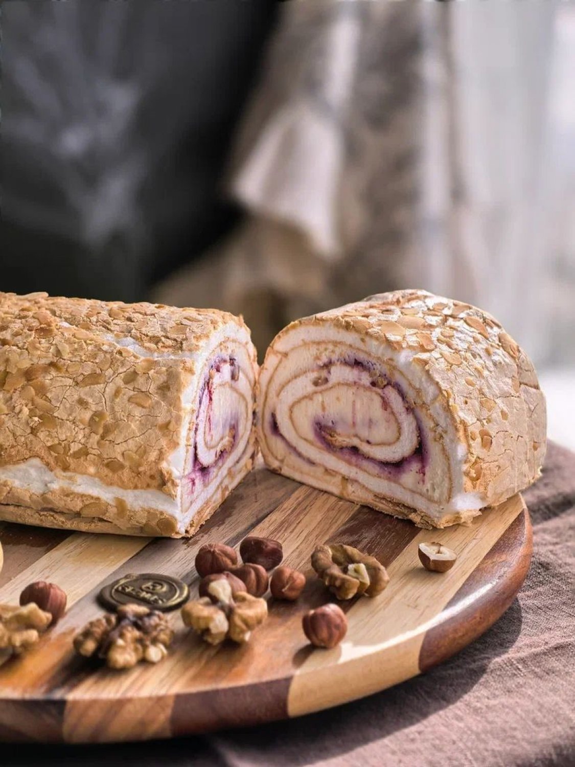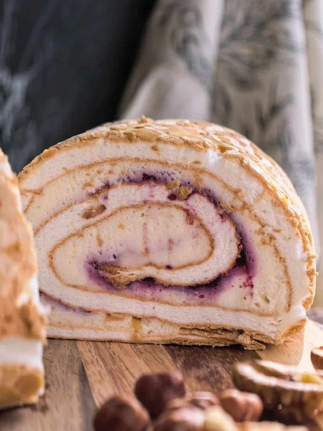 Меренговая основа, крем на основе творожного сыра, ягоды черной смородины, лепестки арахиса.
