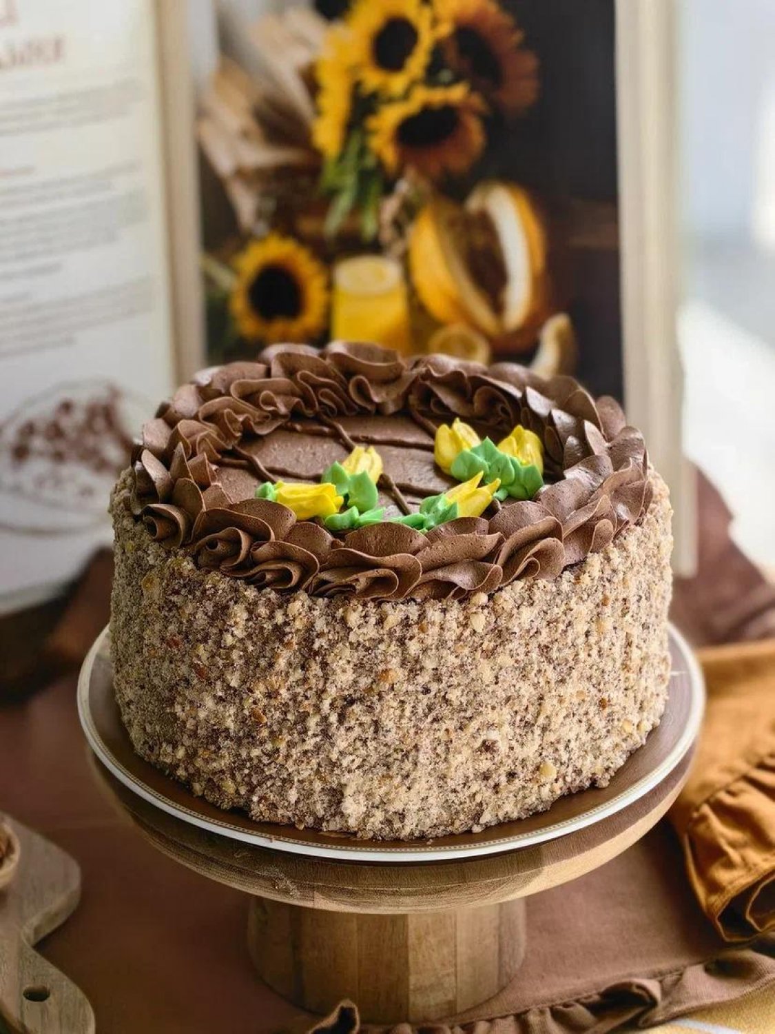 Шоколадный бисквит на кефире, карамель с грецким орехом, шоколадный крем и темный шоколад. Масса: 1100 гр.