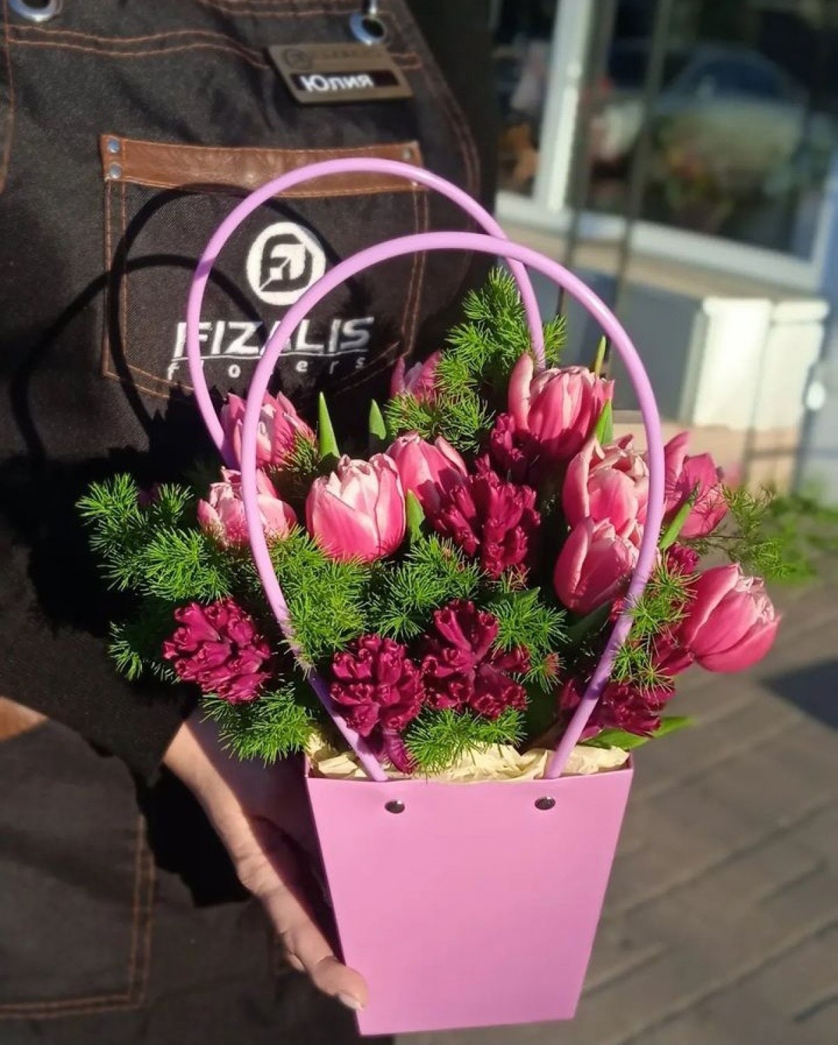 | Описание Тюльпаны пионовидные, Гиацинты, зелень, декоративная сумка, оазис. Внимание: цена цветов может меняться в зависимости от сезона! |